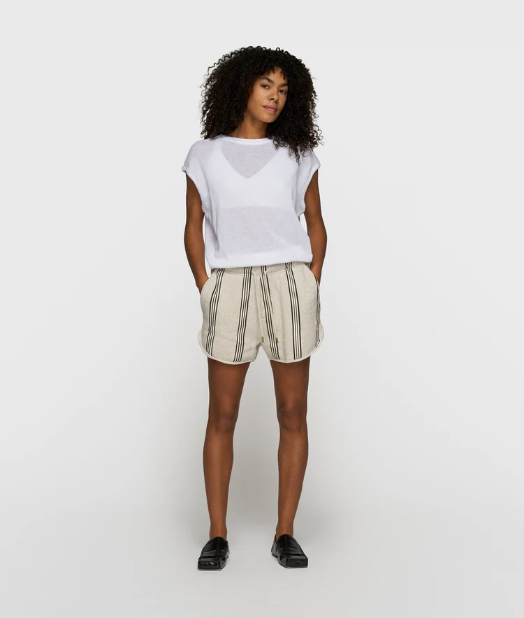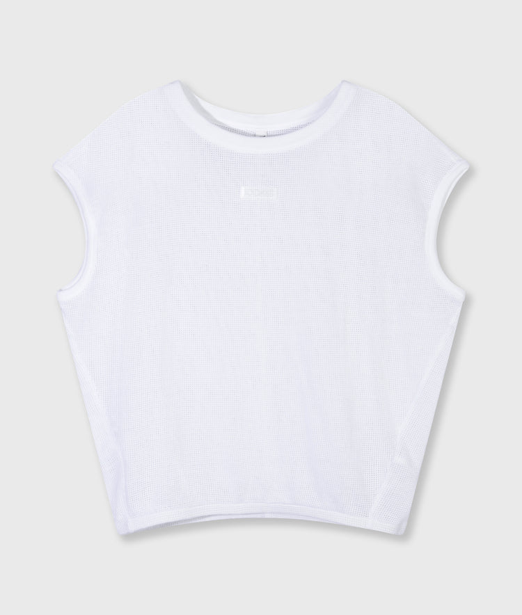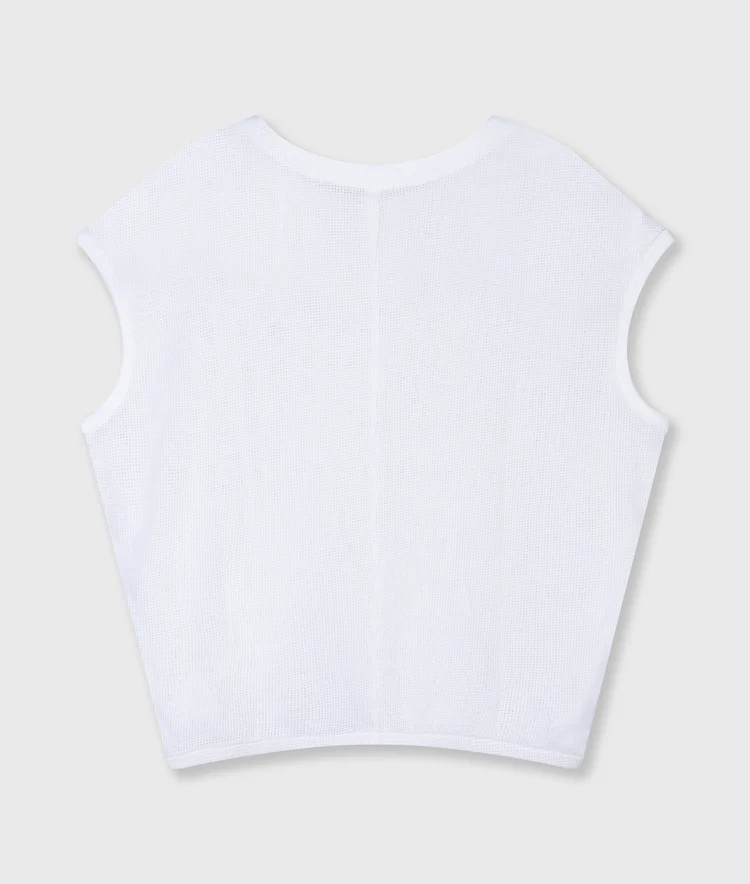 Relaxed fit mouwloos ballon T-shirt, gemaakt van zacht GOTS-gecertificeerd biologisch katoenen mesh. Voorzien van een ribgebreide ronde hals, een geplooide zoom en een klein ‘10DAYS’ label onder de hals.