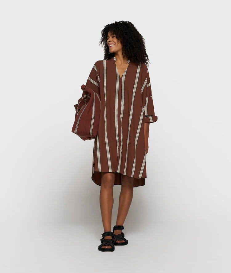 Oversized fit A-lijn tuniek met halflange mouwen, gemaakt van luchtig katoenen paulo poplin met strepen. Voorzien van een opstaande kraag met een split aan de hals, steekzakken, mouwen met manchetafwerking en een ‘10’ monogram borduring boven de linker steekzak.