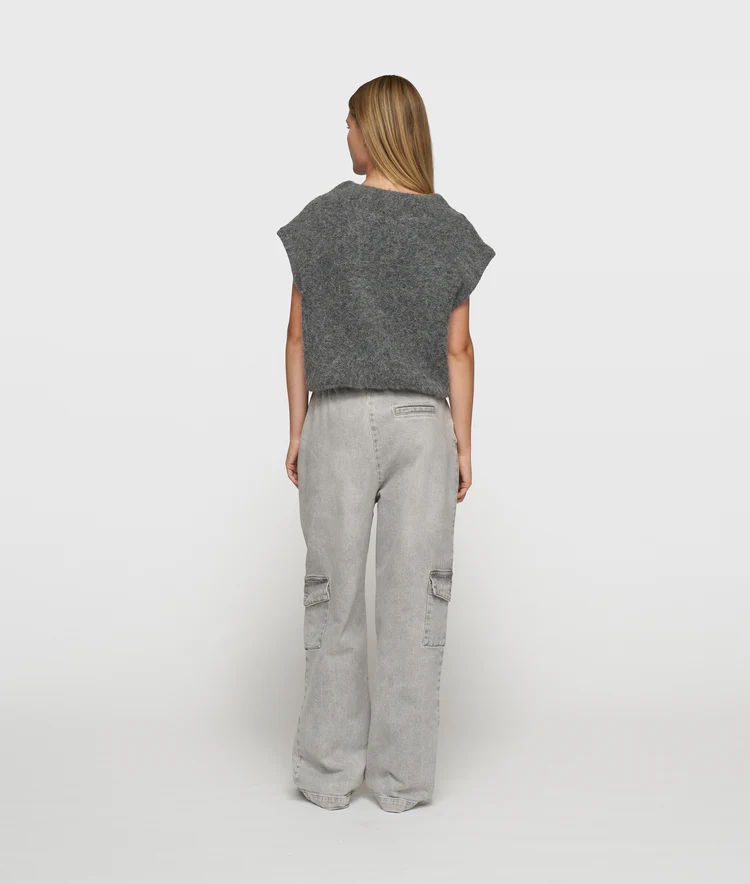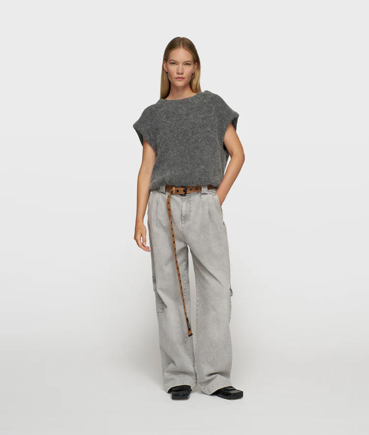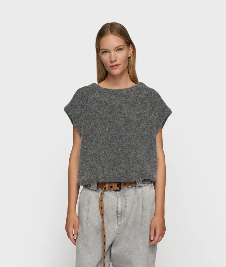 Relaxed fit mouwloze gebreide sweater in ballonshape, gemaakt van zachte alpaca wolblend en een zacht katoenen binnenvoering. Voorzien van een brede ribgebreide hals, een '10' monogram borduring op de schouder en een geplooide en elastische zoom.
