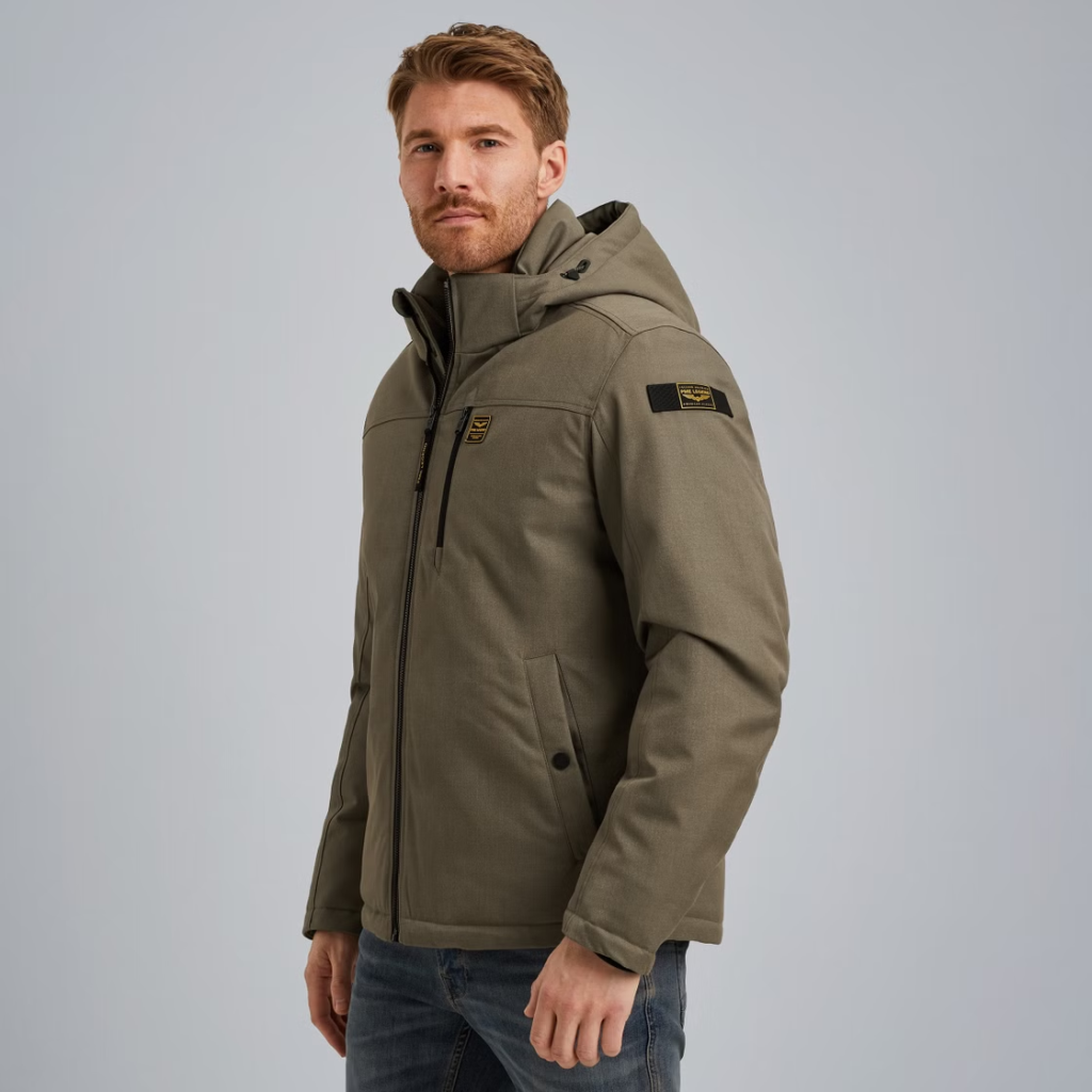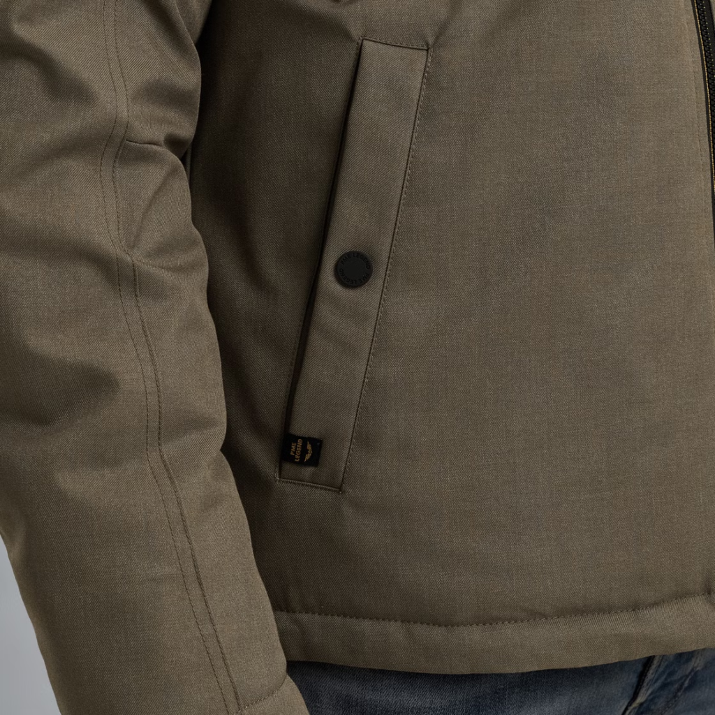 De PME Legend Strator is uitgevoerd in een melange twill met een wollen look. De gecoate achterzijde van de stof maakt van dit model een perfecte all-weather jas. De capuchon is afneembaar en verstelbaar. Ook de cuffs en de heupboord kunnen worden versteld. Deze waterafstotende jas is voorzien van twee zijzakken met drukknopen en fleece voering, een borstzak met rits en een binnenzak met rits. De voering is gequilt in een authentiek hexagoon patroon. De kenmerkende PME Legend details ronden het design af.