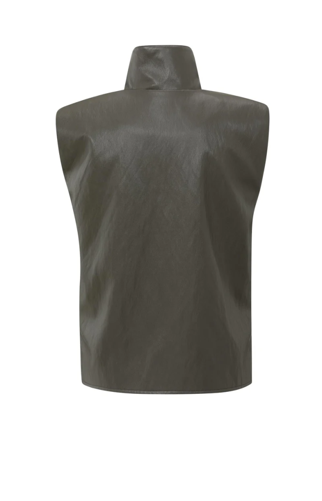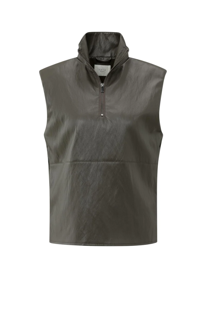 Deze moderne top is gemaakt van soepel imitatieleer en heeft een opstaande kraag met een korte ritssluiting. Het mouwloze ontwerp en de rechte pasvorm zorgen voor een stoere en minimalistische look. Perfect te combineren met een blouse of trui voor een gelaagde stijl.