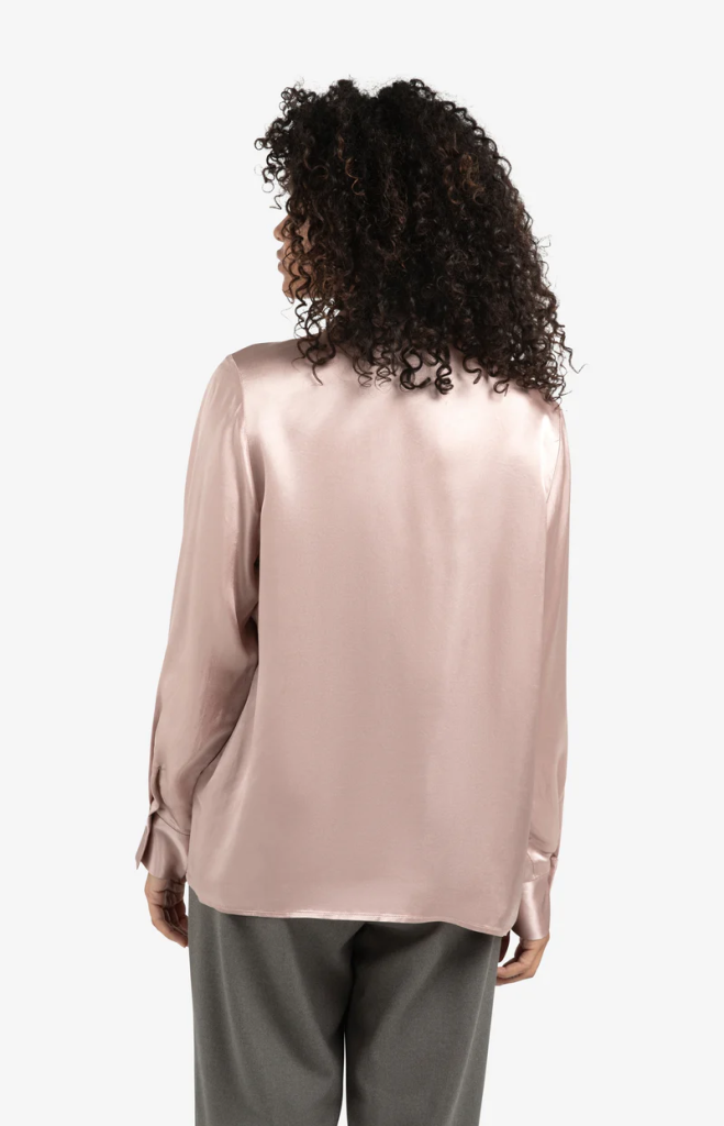 Deze elegante blouse is gemaakt van een glanzende satijnmix en heeft lange mouwen met manchetten, een klassieke kraag en een verborgen knoopsluiting. De rechte pasvorm en zachte glans zorgen voor een verfijnde uitstraling. Perfect om zowel casual als gekleed te stylen.