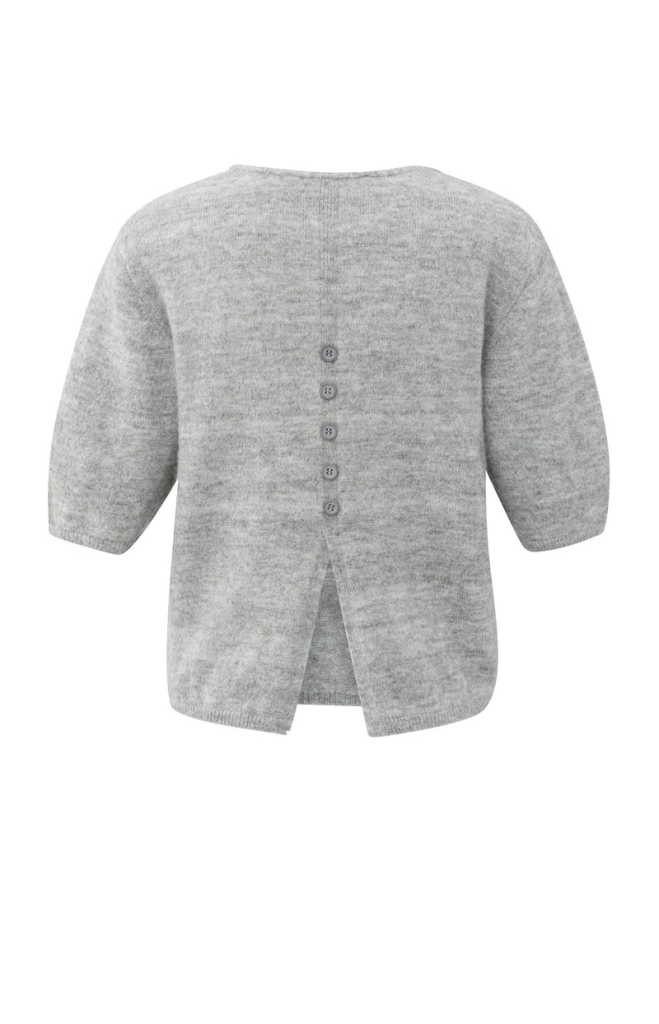 Deze vrouwelijke trui is gemaakt van een zachte gemêleerde garen en heeft korte mouwen, een V-hals en een comfortabele pasvorm. De knopenrij en subtiele split aan de achterkant zorgen voor een speels detail.