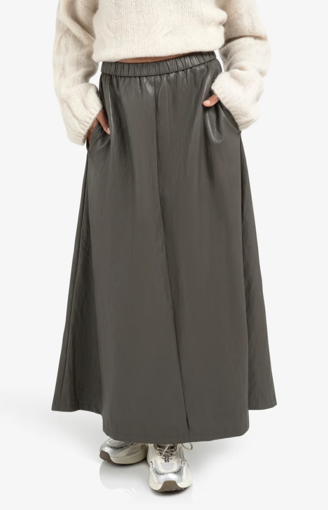 Deze vrouwelijke midi rok is uitgevoerd in een soepel vallende A-lijn en gemaakt van zacht imitatieleer met een subtiele glans. De elastische tailleband zorgt voor extra draagcomfort, terwijl de steekzakken het item een praktische touch geven. Perfect te combineren met zowel knitwear als blouses voor een eigentijdse, elegante look.