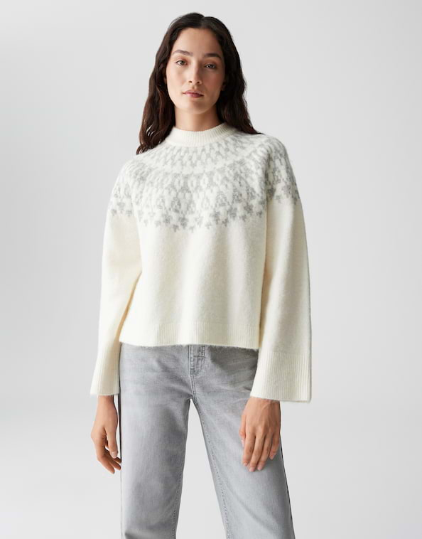 De Noorse trui in een klassiek fair isle-patroon maakt indruk met zijn losse volume in een zachte wol/alpacamix. Of je hem nu draagt met een zakelijke broek of jeans, dit breisel raakt nooit uit de mode.