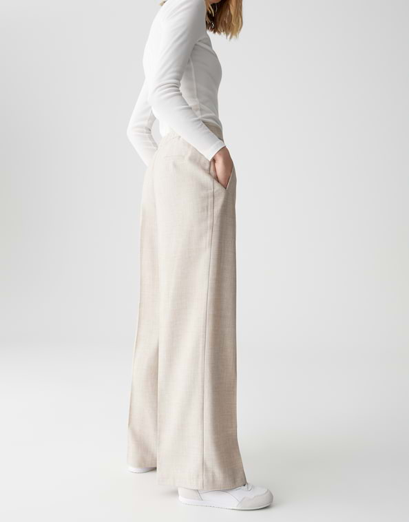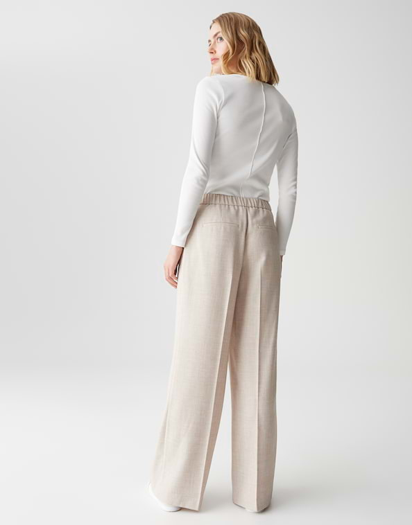 Deze Marlene-broek valt op door zijn lange, wijde pijpen en opvallende vouwen die het silhouet optisch verlengen. Ontworpen in een fijne gemêleerde look, is het een zakelijke stijl met een vrouwelijke uitstraling.