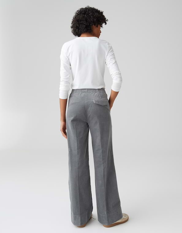 Deze corduroy broek heeft een coole casual look, terwijl de wijde, lange pijpen het figuur flatteren en de elastische tailleband voor extra comfort zorgt. Hij is perfect te combineren met oversized knitwear voor een trendy outfit.