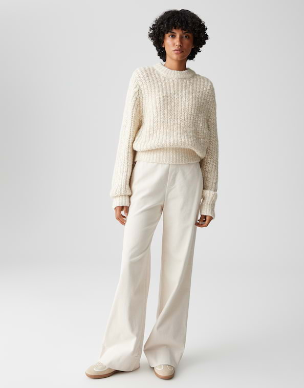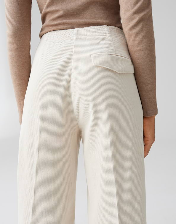Deze corduroy broek heeft een coole casual look, terwijl de wijde, lange pijpen het figuur flatteren en de elastische tailleband voor extra comfort zorgt. Hij is perfect te combineren met oversized knitwear voor een trendy outfit.