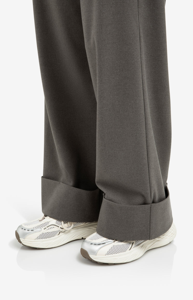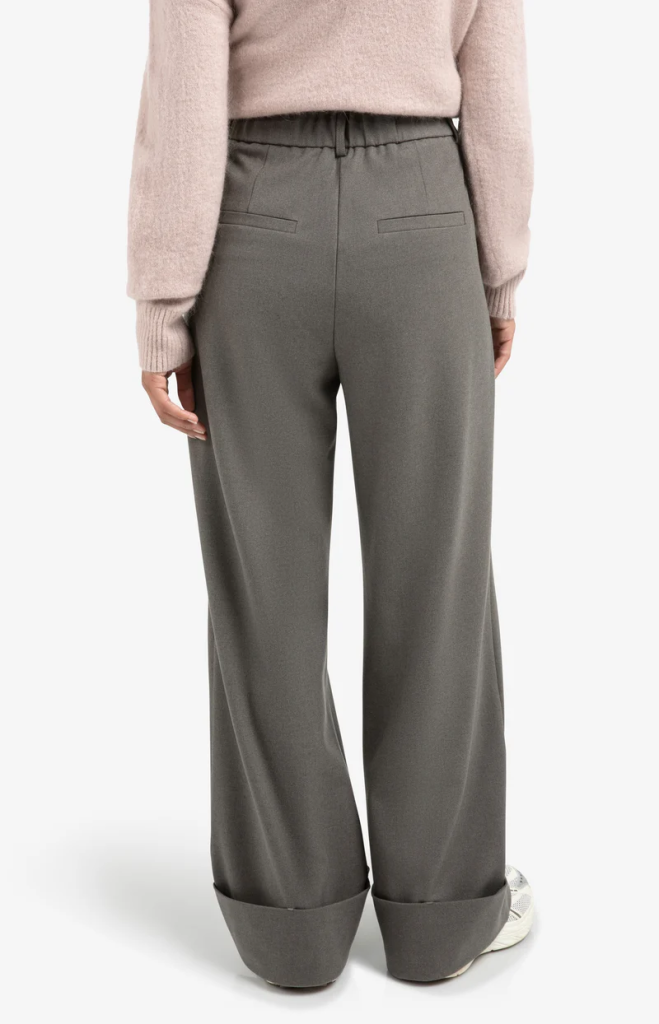 Deze elegante broek is gemaakt van een zachte, gestructureerde geweven stof en is ontworpen met een middelhoge taille en wijde pijpen. De opvallende brede omslagen aan de zoom geven een moderne twist. Afgewerkt met steekzakken, paspelzakken achter en riemlussen