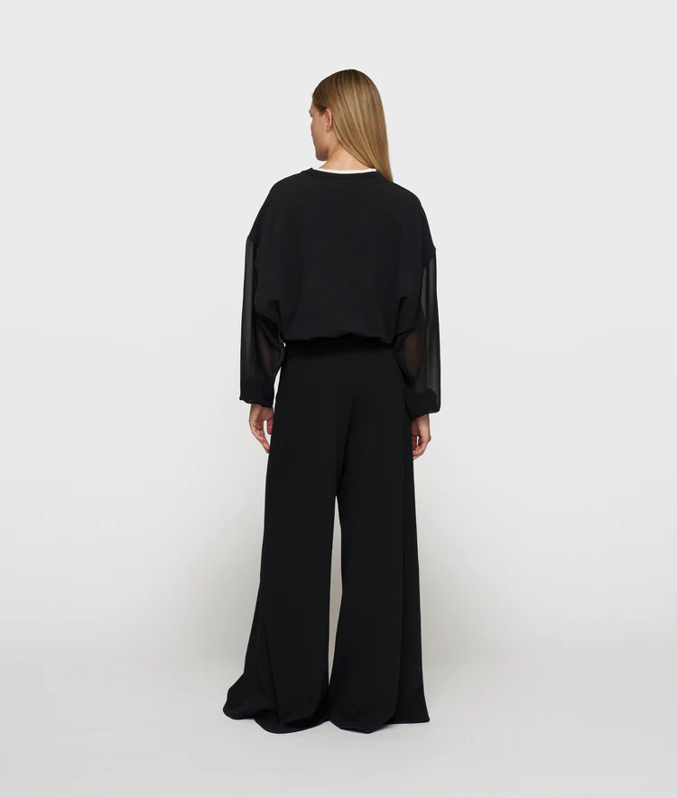 Relaxed fit broek met extra wijde pijpen, gemaakt van zachte stretch crepe. Voorzien van een elastische tailleband met koord en riemlussen, schuine steekzakken, een nep gulp en een '10' monogram borduring onder de linker zak.