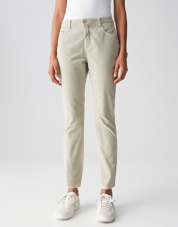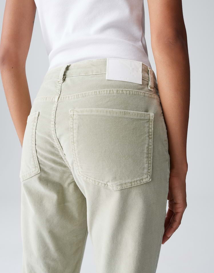De recht gesneden broek is opnieuw geïnterpreteerd met een fluweelachtig oppervlak voor een moderne twist. Perfect te combineren met een gebreide trui en laarzen voor een gezellige winteroutfit.